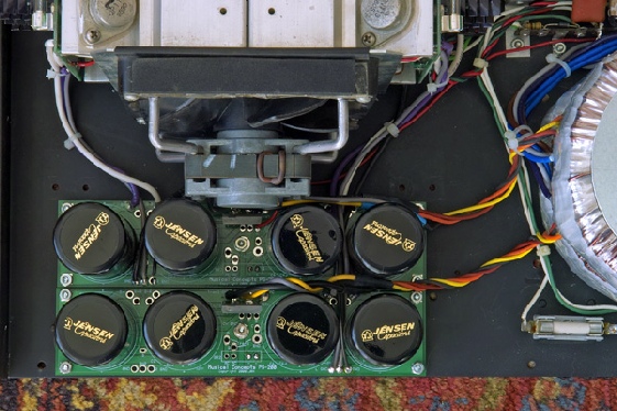 Here is a single PS-200 with the Jensen 10,000uF/63V caps installed in an Adcom GFA-545. If you look closely you'll see that there are two stacked 330VA toroid power transformers too. This produces totally dual-mono operation. The modified amp sounds so natural, clear, three dimensional and instantaneous that, like live music, it can be soothing and exciting at the same time. These extraordinary Jensen caps beautify everything they touch! This audiophile had some definite ideas about the results here.