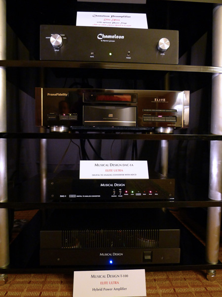 Musical Design supplied our Chameleon Elite Preamplifier, mostly used with the PC-2T Acitve Board and a single, superb mid-50s Tungsol 5687 tube, though the PC-5T Active Board with twin NOS 12AU7 Conn Organ tubes(Westinghouse we think) saw some service too. This particular Chameleon did not have a phono stage since no turntable was in service. This makes it a $2995 preamp. On Friday the 10th we used the Musical Design T-100 Elite power amp, $2995. Then on Sat. And Sun. we used the new solid-state DM-100D Elite Ultra power amplifier, also $2995. Our electronics were a consistent $5990 during the show.