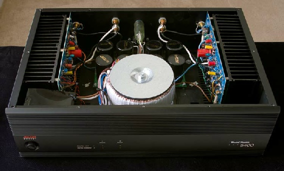 HERE IS A LOOK INSIDE OF A NEW MUSICAL DESIGN HYBRID AMPLIFIER.............. It sounds just too natural to believe. Be prepared for a level of detail and an acoustic envelope that is truly breathtaking. A few details: You see a pair of NOS 6922 tubes operating at 250VDC, but you can use the 6N1P, 6DJ8, ECC88, 7308 and the other 6DJ8 variants. Those are MOSFET outputs you see on the heatsinks. You are also looking at an incredibly simple SRPP front-end with no feedback!!! You see it here installed into the Musical Design D-75/DM-100 chassis which the amplifiers will share. We rate it at 100W/CH. A less powerful 75W/CH version is available too for use with efficient speakers and bi-amping. The 100W version has four MOSFETs per channel, larger heatsinks and taller chassis. This is our all-out version with Jensen filter caps for all except heater voltages. Our Platinum grade resistors are used in most positions. You see the Audience Aura-T Teflon coupling capacitor used in coupling applications. Some of you will notice the little red BlackGate cap there and Cardas connectors on the back. Our T-100 Elite Ultra model is $4495.